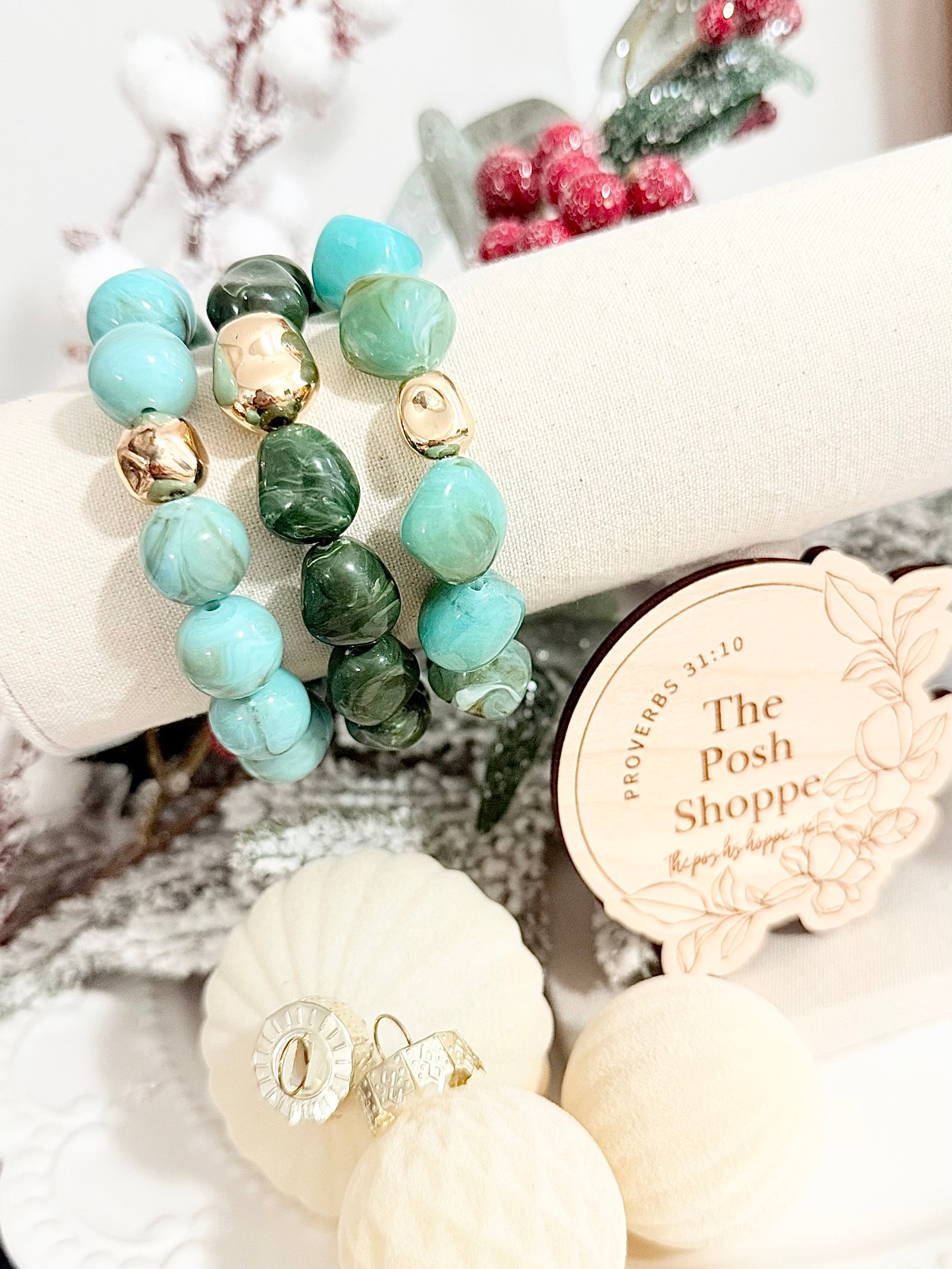 Shades of turquoise and deep forest green come together for a winter wonderland vibe with pretty gold spacer beads. Stretchy!