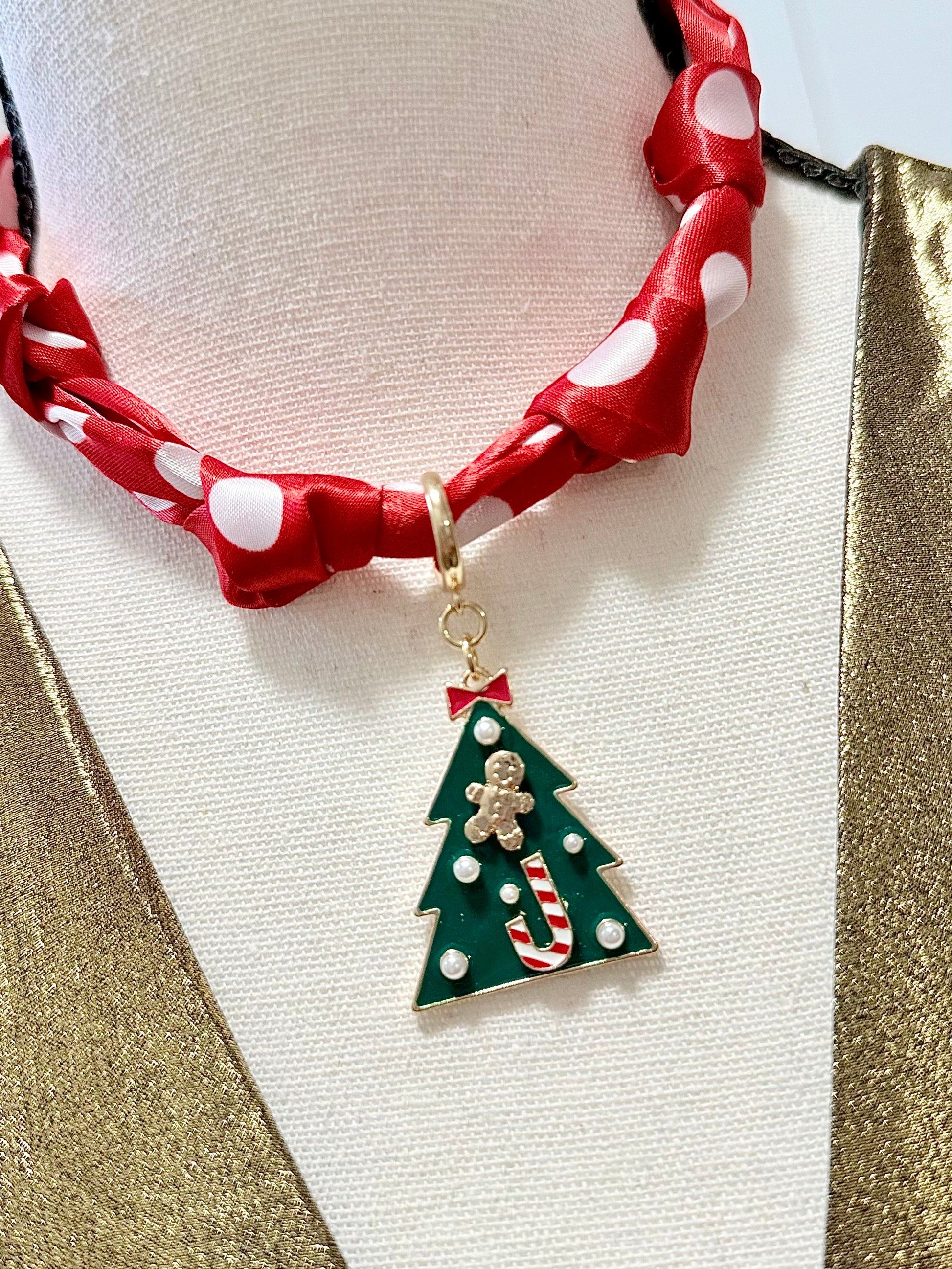 Add a touch of Christmas cheer to your outfit with this Gingerbread Joy Scarf Necklace! Featuring a soft red-and-white polka dot scarf-style and a darling Christmas tree pendant adorned with a candy cane, pearls, and a tiny gingerbread man — it’s the perfect mix of cozy and chic. 🎁✨ Adjustable