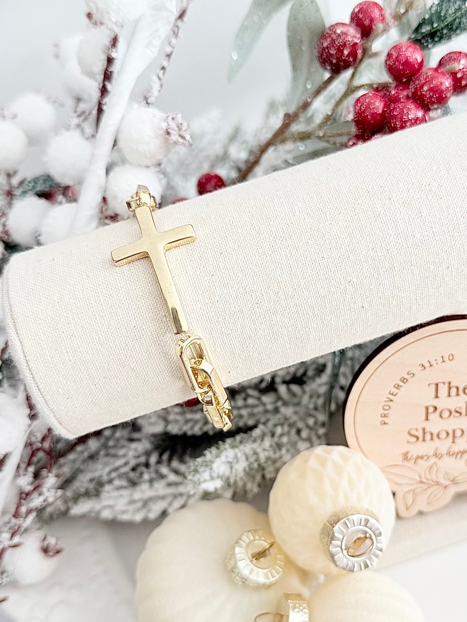 Faith and fashion meet in this elegant gold bracelet with a sleek cross design. A meaningful piece that shines with every wear — ideal for Christmas and beyond. Stretchy!