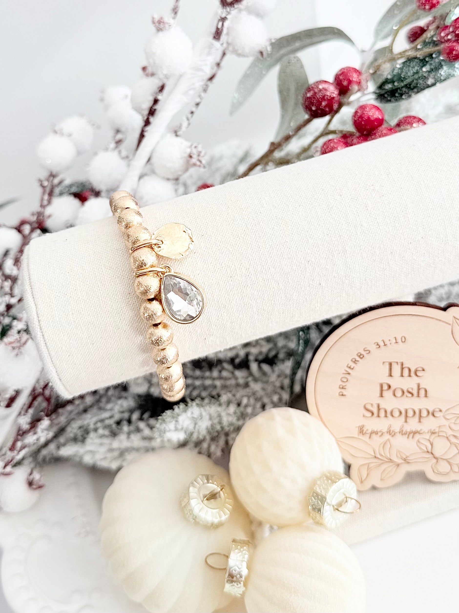 This shimmering gold stretch bracelet with a crystal teardrop charm and hammered texture adds just the right amount of holiday sparkle. Perfect for Christmas gatherings or New Year’s celebrations! Stretchy!
