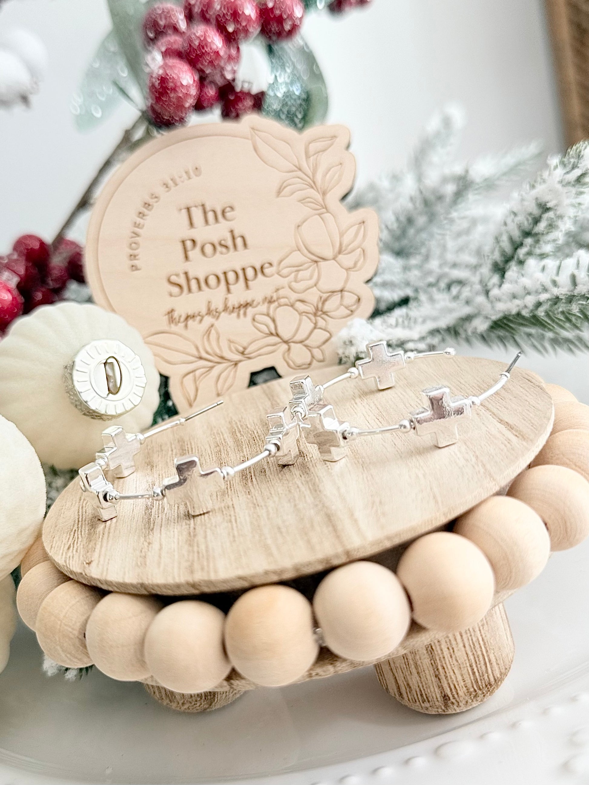 Beautifully symbolic and effortlessly chic, these silver hoops are adorned with a circle of dainty crosses — a perfect blend of faith and fashion. Lightweight and meaningful, they’re a stunning reminder to wear your faith with grace every day. 1.75”