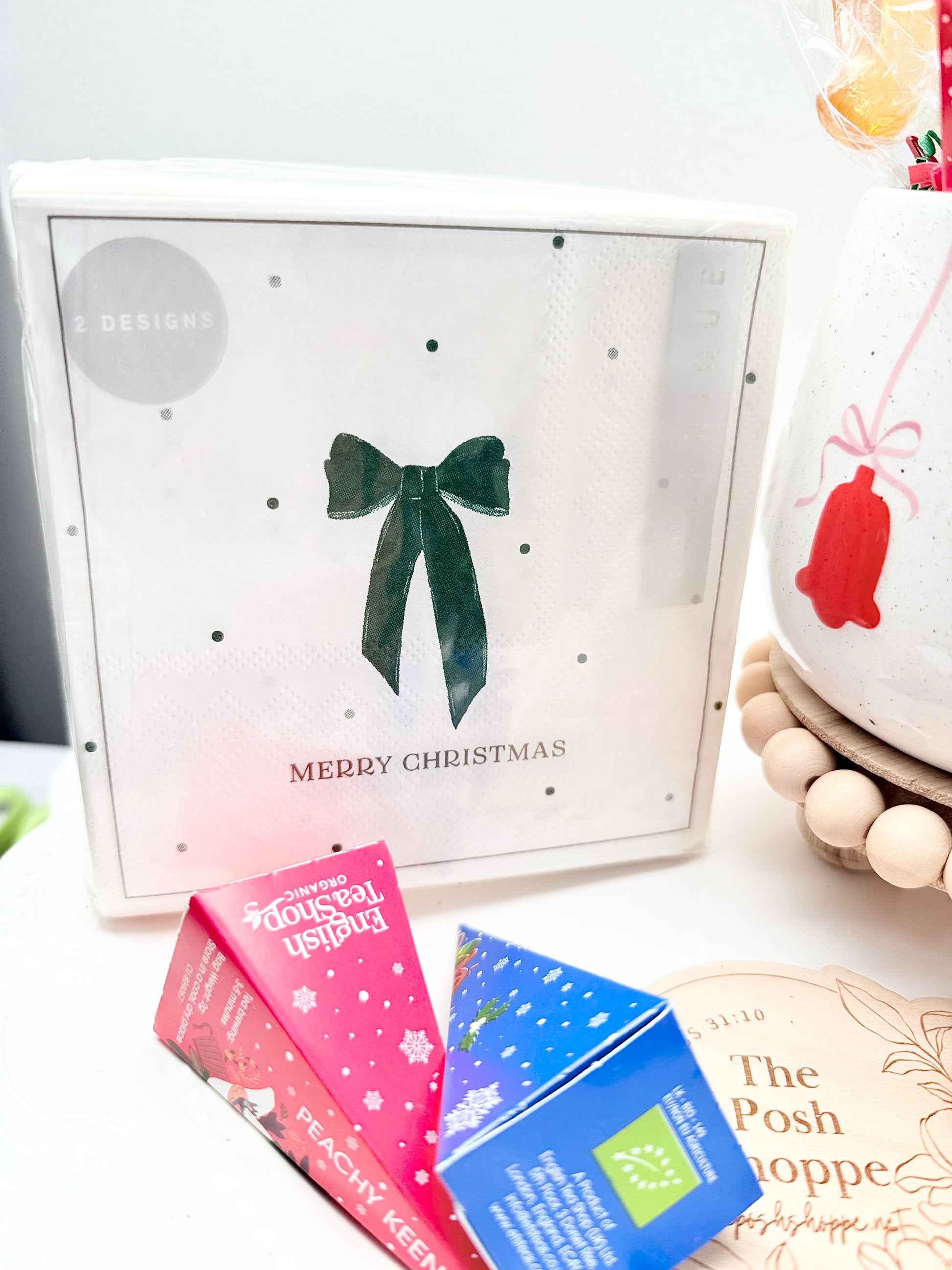 A darling Christmas mug for a Tea lover! filled with festive goodies, seasonal teas, gingerbread shaped honey stirring stick, cute napkins + holiday cheer! Each set is beautifully wrapped in clear festive wrap, finished with a cute Christmas ornament and a gorgeous bow (just like the final photo shown). Perfect for teachers, coworkers, friends, and stocking stuffers! 🎅🏻✨❤️